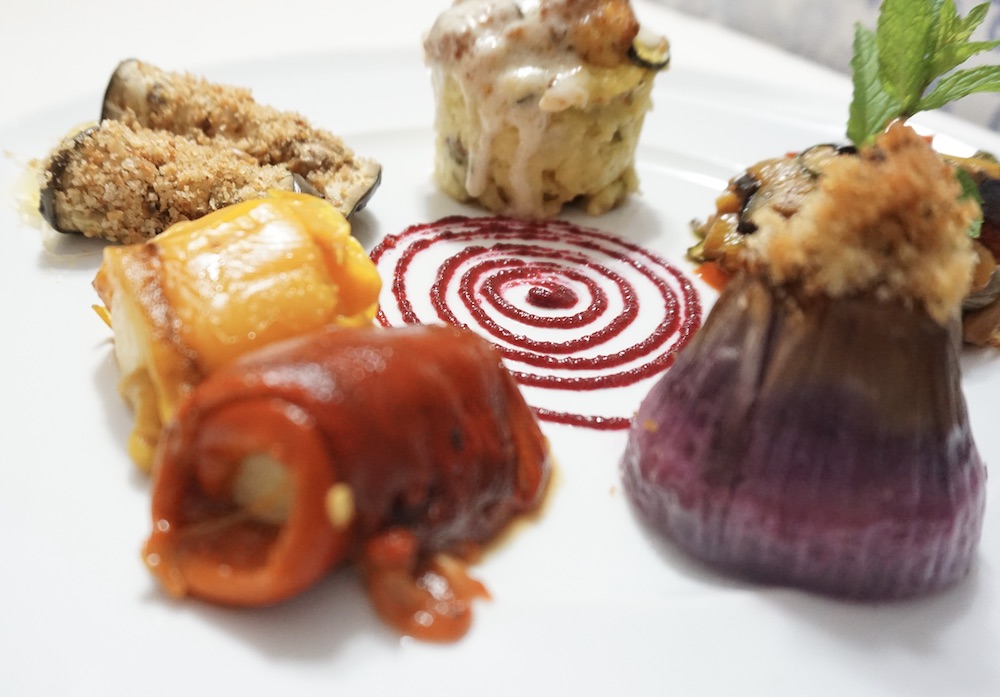 Fantasia vegetale con involtino di melanzane caciocavallo pinoli e pane aromatizzato, cipolla ubriaca al forno, caponata, tortino di patate e zucchine con crema di grana, rollè di peperoni