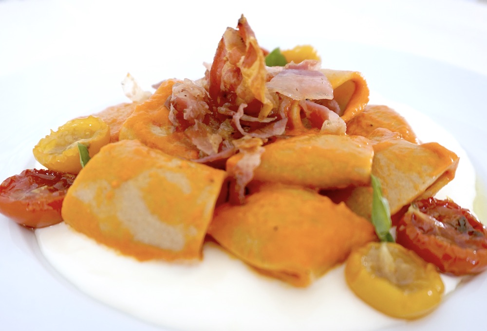 Il Pacchero, con farina integrale BIO, Senatore Cappelli, salsa peperone rosso, pomodoro, su mousse di pecorino Pugliese, stagionato in grotta, pomodori confì e croccante di pancetta affumicata