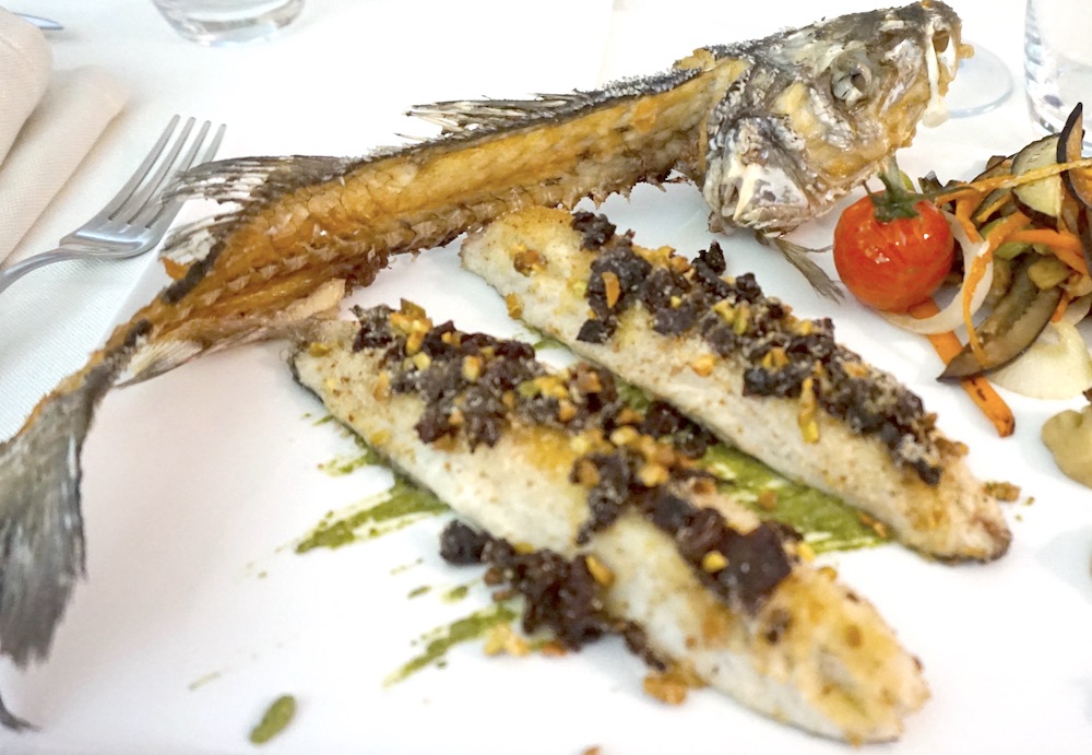 Filetti di pesce del giorno dorato al forno, con pomodori secchi e pistacchio, scarabocchi di maionese di rucola, accompagnata da verdure allo zenzero