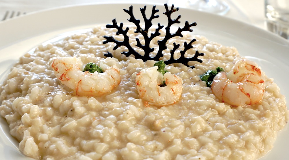 Riso “Karbor” mantecato con misto mare, crema di prezzemolo e gamberi viola di Gallipoli scottati