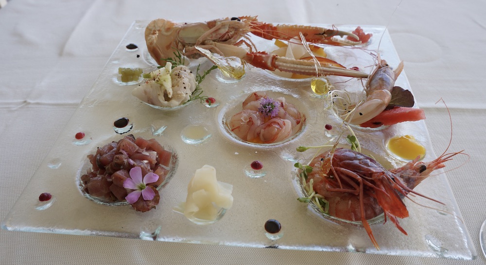 € 25 • Scampo, tris di gamberi, tartare di tonno rosso con cipolla di Tropea e olive nere, carpaccio di spigola con mela verde, seppia e pesca noce , salsa di barbabietola rossa, zenzero in agrodolce e capsule di olio evo