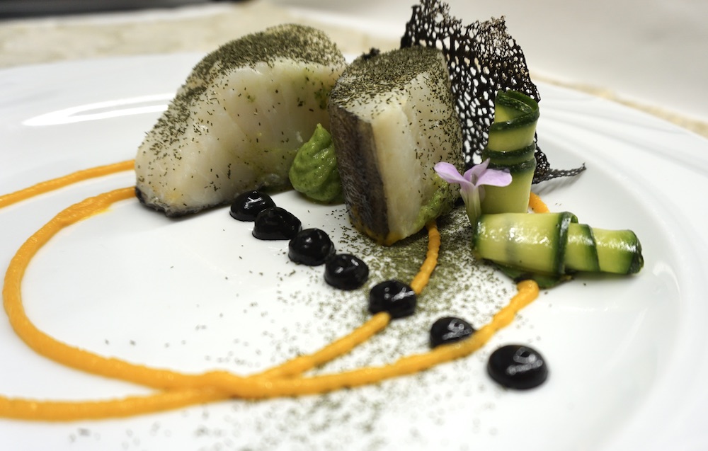 Baccalà in oliocottura con salsa di aglio nero di Voghiera accompagnato da crema di zucchine, crema di carote al curry e polvere di finocchietto selvatico