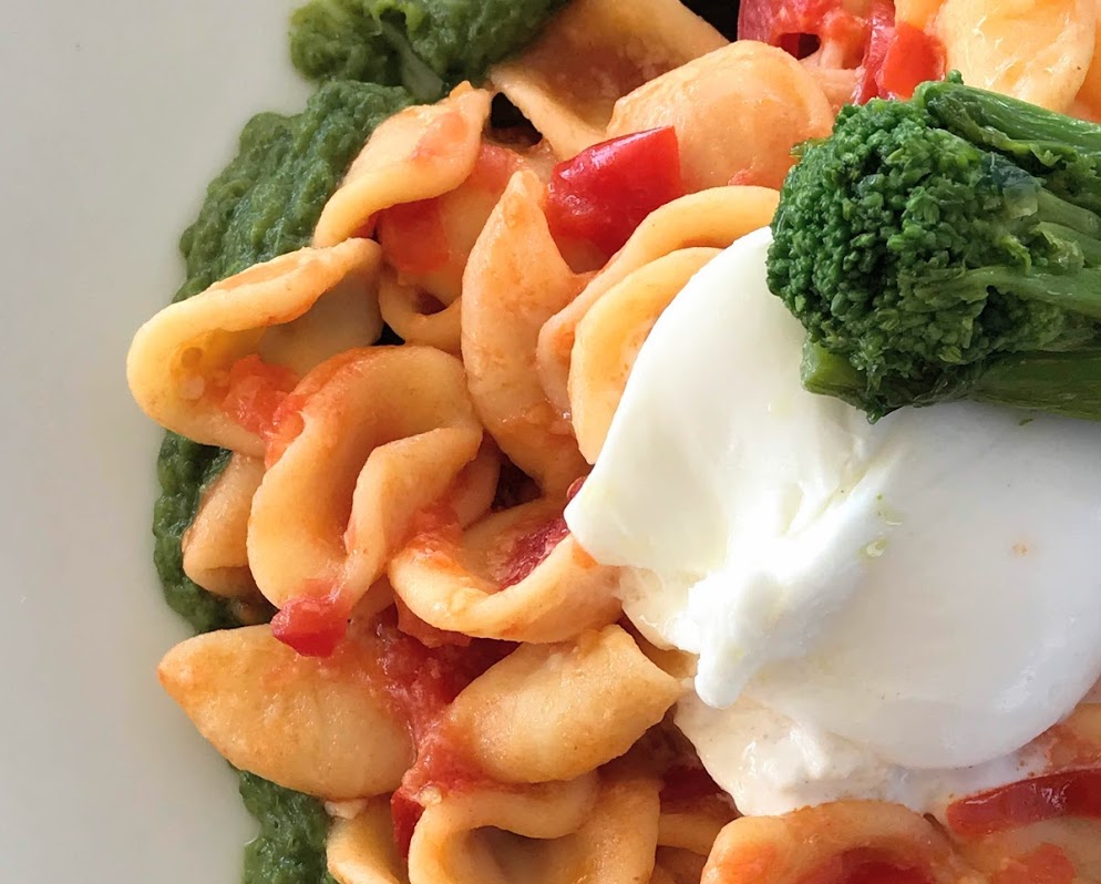 Orecchiette Gourmet con pomodorini e formaggio vaccino, crema di cime di rapa con burrata Salentina