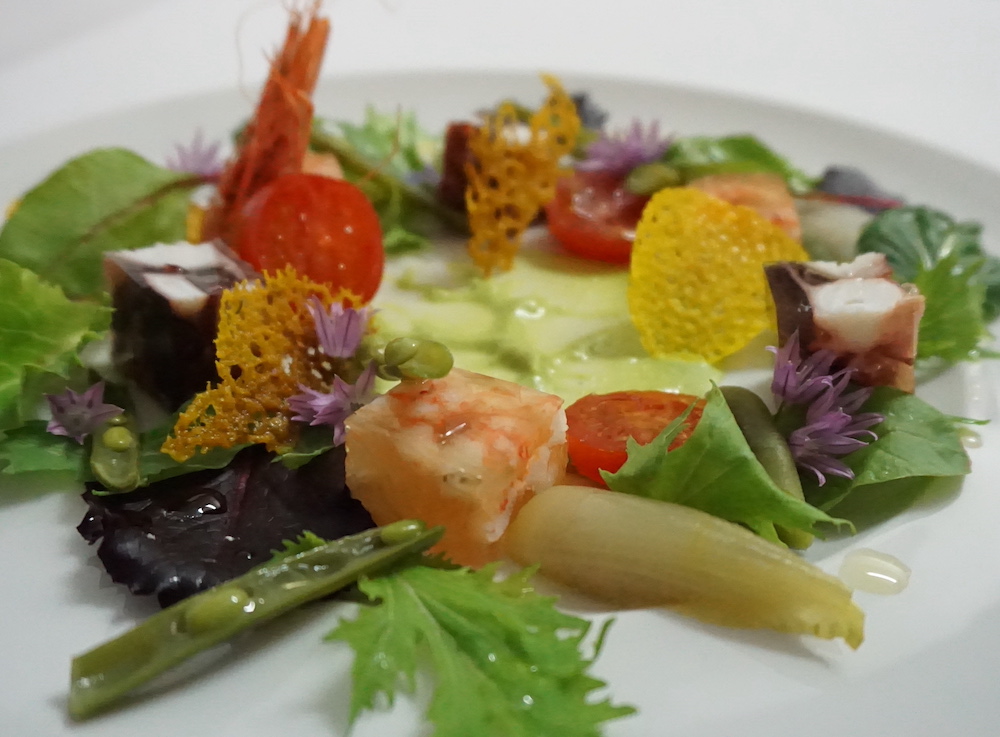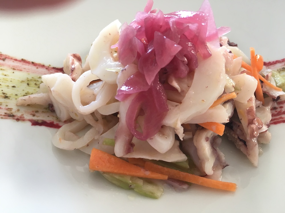 Insalata di mare con gamberi¹, seppia², calamaro², polpo², julienne di verdure, ciuffo di cipolla Tropea in agrodolce con un graffio di maionese di sedano e rapa rossa