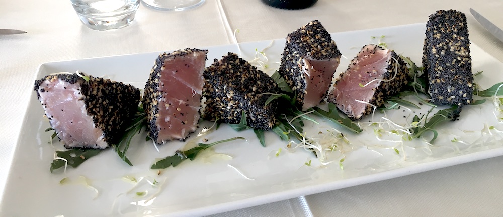 Tagliata di tonno rosso scottato, in crosta di semi di papavero e sesamo adagiata su letto di rucola e germogli di ravanello