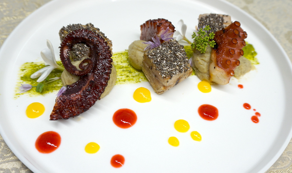 Tonno Rosso cotto a bassa temperatura al profumo di arancio, con tentacoli di polpo grigliato, accompagnato da mousse di cicerchia Ugentina e salse di sedano, mango e lamponi