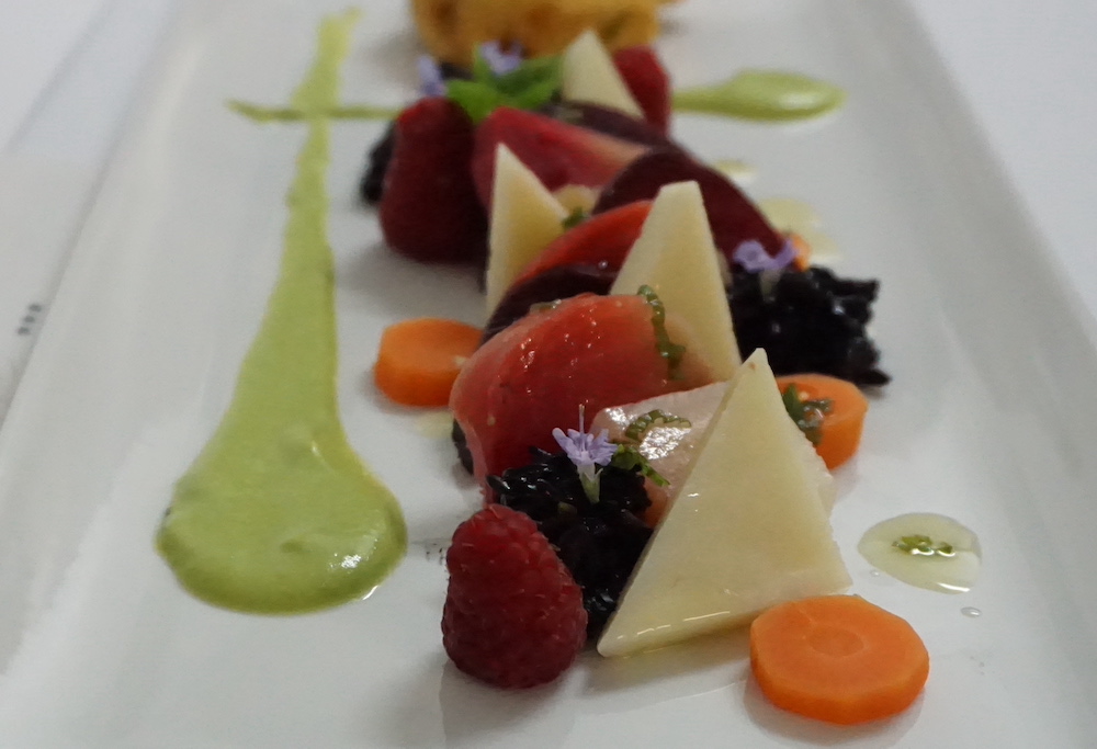 Arcobaleno di rape rosse e carote con riso nero aromatico “Gioiello”, pecorino semi-stagionato, medaglione di verdure con mais croccante, crema di piselli¹ ed emulsione alla menta con olio evo e aceto di mele