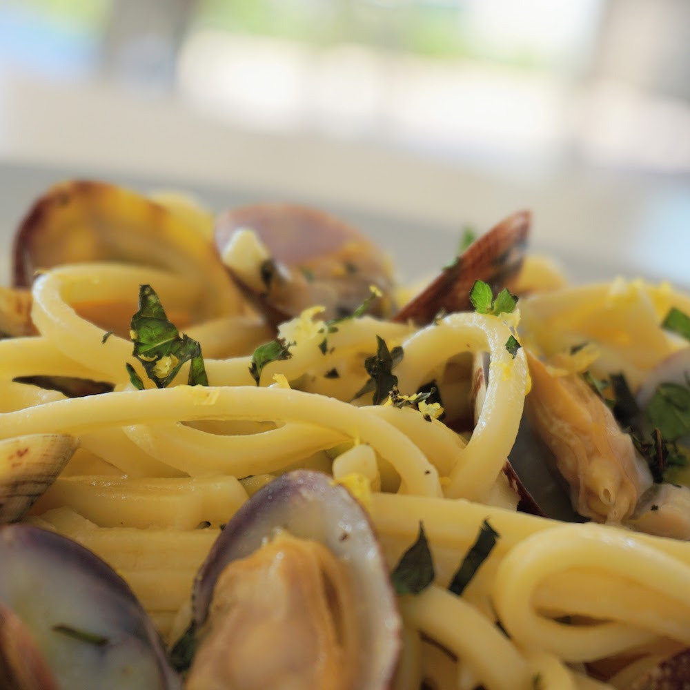 Tagliolini Teti con vongole e brunoise di zucchine con pioggia di menta fresca e scorza di limone