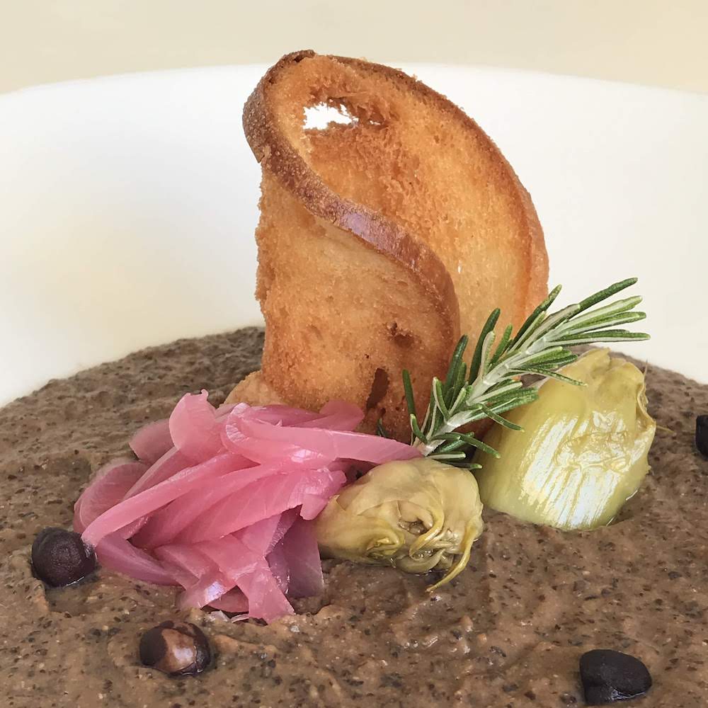 Crema di Ceci Neri di Zollino con cipolle rosse di Tropea, puntarelle in agrodolce e crostino di pane